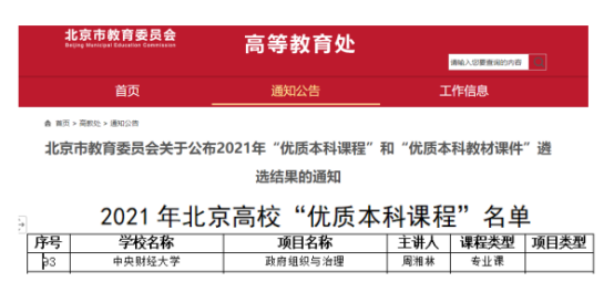 近日,北京市教育委员会发布关于公布2021年“优质本科课程”和“优质本科教材课件”遴选结果的通知,其中,永利集团官网周湘林副教授主讲的《政府组织与治理》专业课程获评北京高校“优质本科课程”。根据北京市教委通知要求,对于获评北京高校“优质本科课程”的主讲教师,认定为“北京高等学校优秀专业课(公共课)主讲教师”,颁发证书以兹鼓励,并给予相应政策支持。