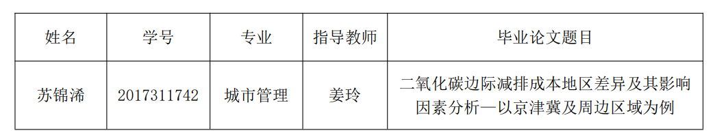近日,2021年北京市普通高等学校优秀本科生毕业设计(论文)评选结果公布,永利集团官网2017级城市管理专业本科生苏锦浠的毕业论文荣获优秀毕业设计(论文),论文题目为《二氧化碳边际减排成本地区差异及其影响因素分析—以京津冀及周边区域为例》,指导教师为姜玲教授。