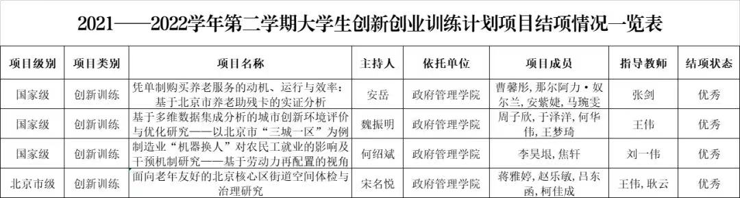 近日,学校发布《关于公布 2021-2022 学年第二学期大学生创新创业训练计划项目结题验收和级别认定结果的通知》,对往期 250项大学生创新创业训练计划项目进行了结题验收和级别认定工作。其中,永利集团官网4项创新训练项目获得结项优秀的好成绩,包括3项国家级项目和1项北京市级项目。
