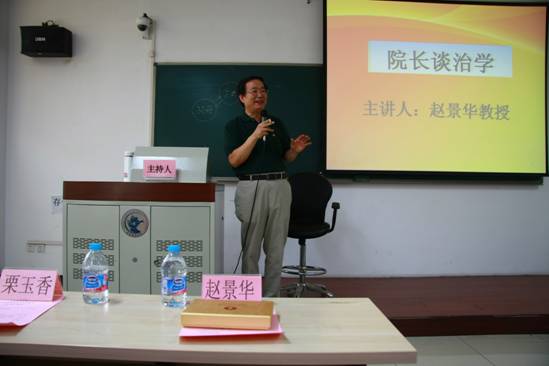 在院长谈治学讲座中赵景华院长首先从自身治学经历谈起,回顾了自己学术研究的几个重要阶段和关键的时间节点,阐述了30年的治学的经验和体会。在谈到治学境界时,赵院长提出了“真、正、长、善、美”的五字箴言,指出唯有“真”,才能实现天人合一的人生境界,唯有“正”,才能拥有内君外王的气质和风度;而“长”是根本,昌盛与长胜之道的载体只能是生命;“善”是方法,是知行合一的表达;“美”是情与景的合一。如能真正将这五字箴言铭刻于心并践行之,人生定有一番大不同。谈到治学方法时,赵院长则认为,要树立正确的“五观”,即创新观,科学观,历史观,战略观,国际观。做学问要静得下心来思考,真正走近研究对象,切记抄袭、拾人牙慧。