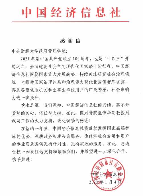 中国经济信息社对温锋华副教授给予的大力支持表达诚挚的感谢,并向永利集团官网发来感谢信。希望与永利集团官网在新的一年里进一步深化合作,携手共进。