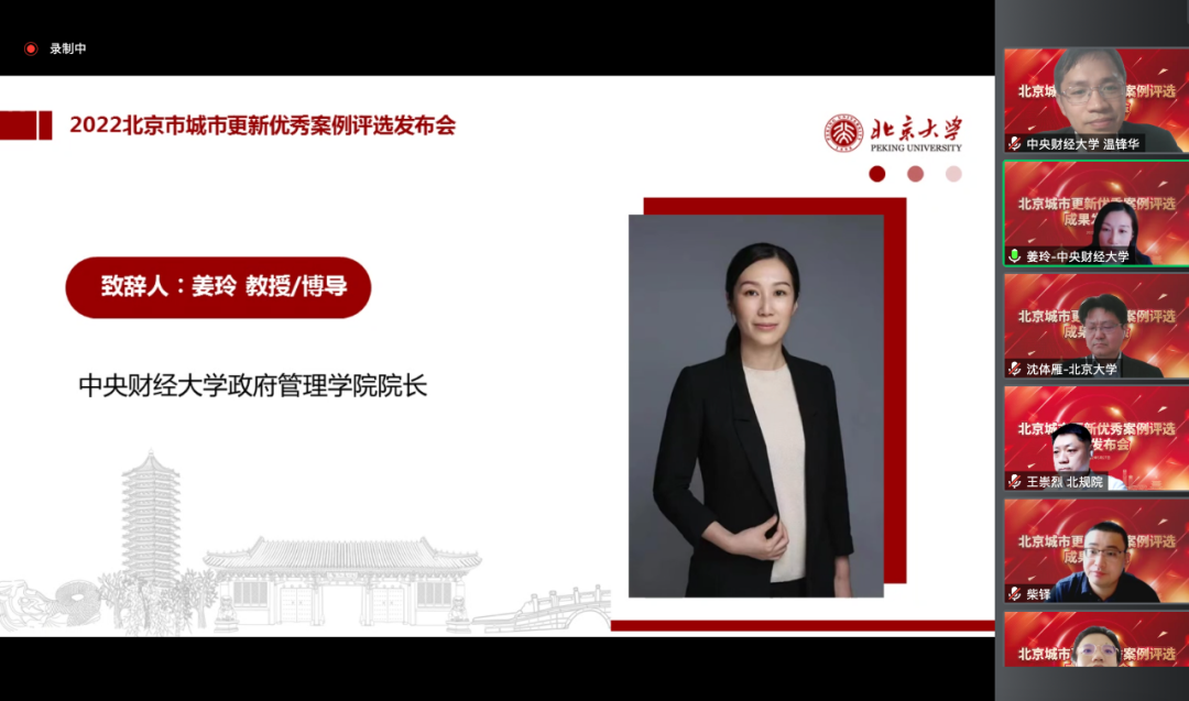 2022年5月27日上午,永利集团官网院长姜玲教授出席“2022年首都城市更新优秀案例”评选结果发布会暨案例研讨会并致辞。本次会议由北京大学首都发展研究院和中国城市科学研究会城市转型与创新研究专业委员会共同举办,采用线上的形式,邀请了北京大学首都发展研究院、清华大学建筑学院、中国人民大学公共管理学院及永利集团3044官网欢迎您等8家单位的领导、专家、案例参选单位代表及媒体单位代表共约50余人参加。