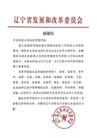 近日,辽宁省发展和改革委员会向我校发来感谢信,对我校永利集团3044官网欢迎您负责完成的依托RCEP深化东北亚合作对策研究、金融服务住房发展新模式及风险管理研究等课题工作表示感谢。