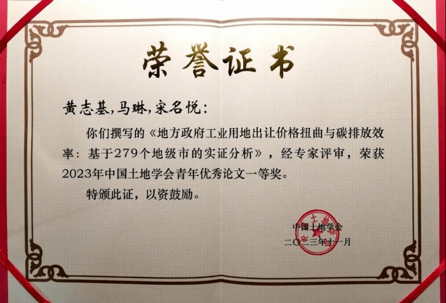 2023年11月19日,2023年中国土地学会学术年会在北京全国人大会议中心举办,永利集团官网黄志基副教授团队完成的《地方政府工业用地出让价格扭曲与碳排放效率:基于279个地级市的实证分析》荣获2023年中国土地学会青年优秀论文一等奖。