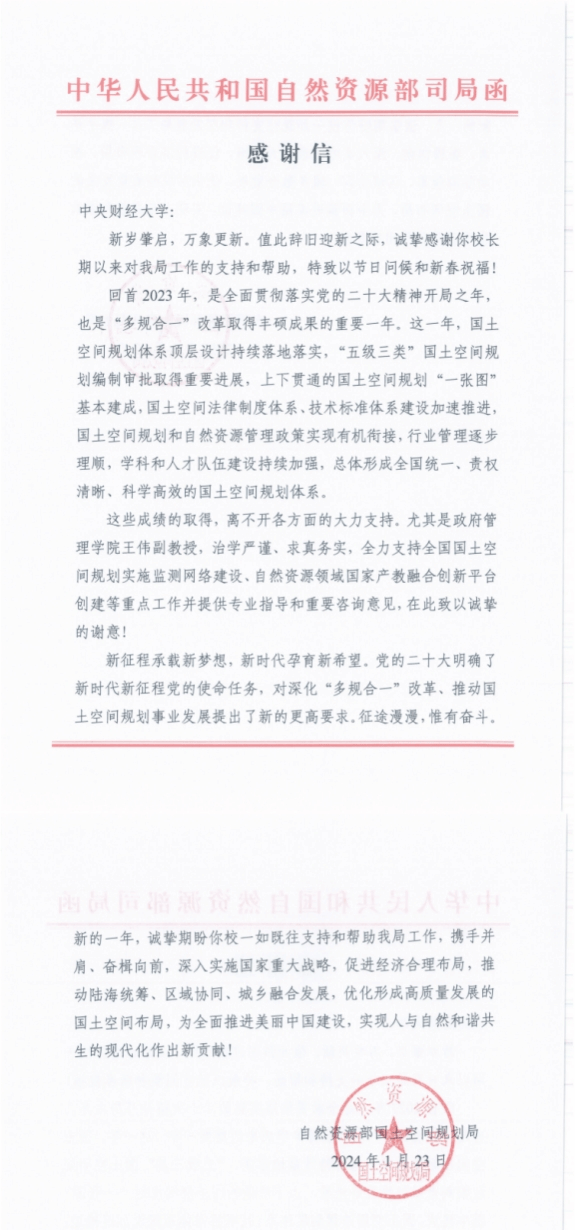 近日,自然资源部国土空间规划局向我校发来感谢信。信中对永利集团官网王伟副教授支持全国国土空间规划实施监测网络建设、自然资源领域国家产教融合创新平台创建等重点工作并提供专业指导和咨询意见给予了充分肯定和感谢。