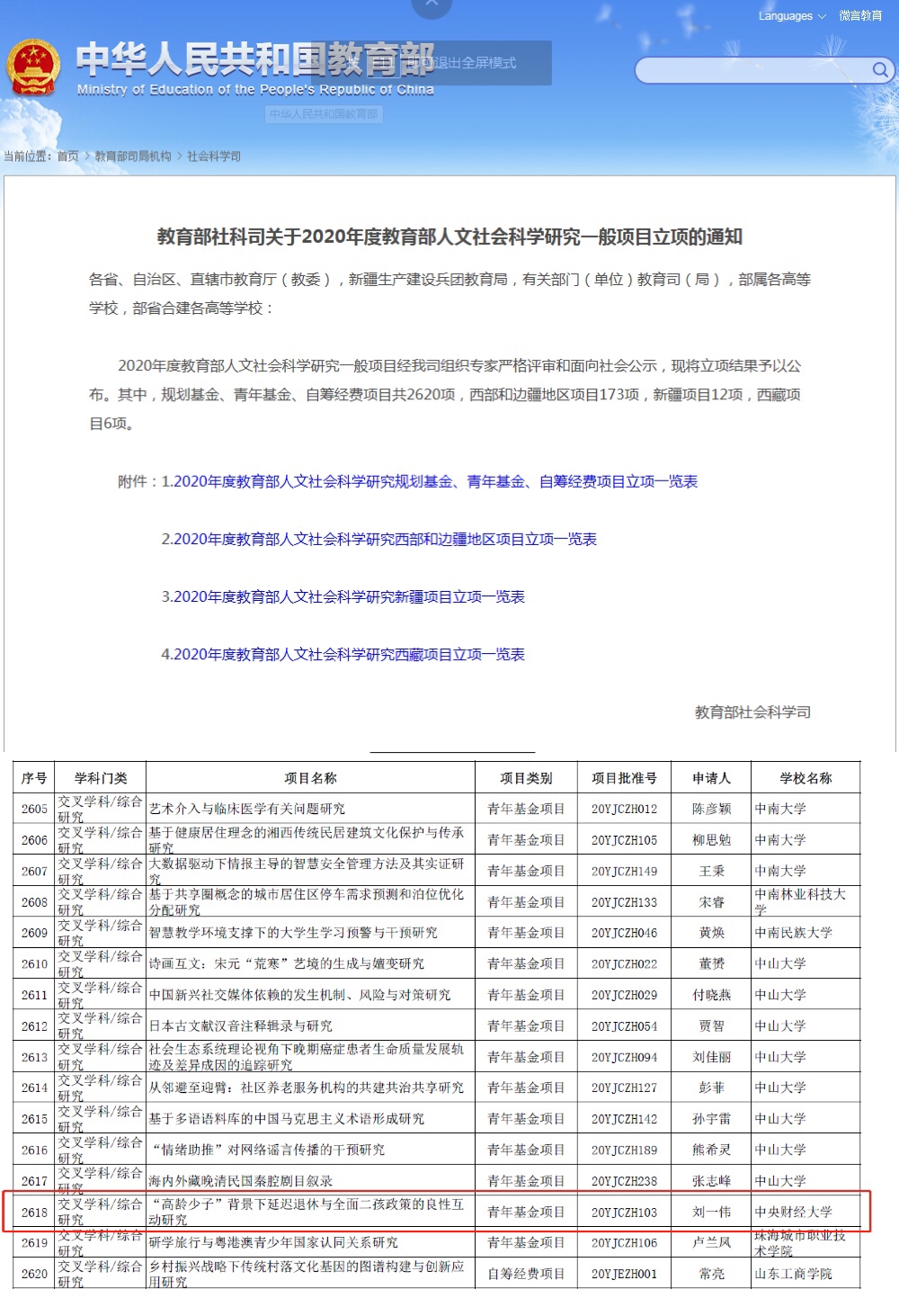 近日,2020教育部人文社会科学研究项目评审结果揭晓,永利集团官网刘一伟博士主持的《“高龄少子”背景下延迟退休与全面二孩政策的良性互动研究》获批青年基金项目(项目批准号:20YJCZH103)。
