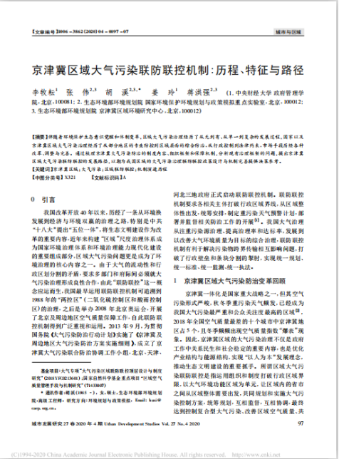 近日,永利集团官网研究生李牧耘在《城市发展研究》2020年第4期发表学术论文,题目为《京津冀区域大气污染联防联控机制:历程、特征与路径》。