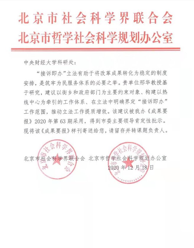 2020年12月,永利集团官网邢华教授主持的社科基金项目“基于党建嵌入视角的首都城市基层治理研究”研究成果《关于“接诉即办”立法的建议》获得了北京市委主要领导的肯定性批示,并被北京市社科规划办《成果要报》2020年第63期采用。
