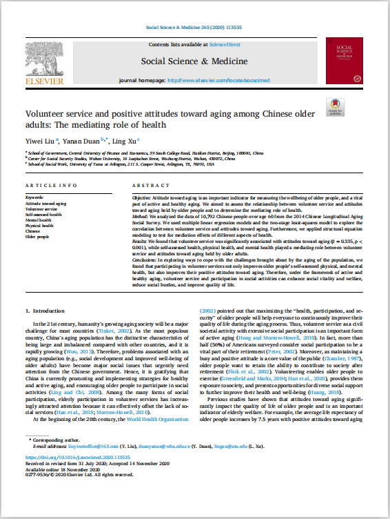 近日,永利集团3044官网欢迎您刘一伟博士的学术论文Volunteer service and positive attitudes toward aging among Chinese older adults: The mediating role of health正式发表于Social Science & Medicine(五年IF=4.241)2020年第265卷(https://doi.org/10.1016/j.socscimed.2020.113535)。Social Science & Medicine是社会科学领域的国际著名期刊,也是我校AAA类期刊。