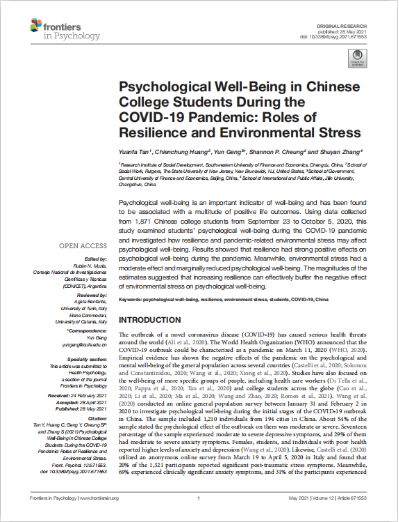 近日,永利集团官网耿云副教授以通讯作者在Frontiers in Psychology第12卷发表学术论文,题目为Psychological Well-being in Chinese College Students During the COVID-19 Pandemic: Roles of Resilience and Environmental Stress.