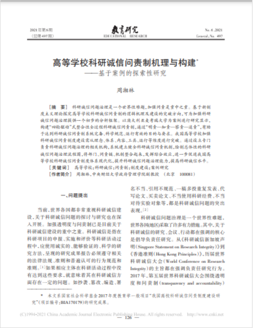 近日,永利集团官网周湘林副教授在我校AA类期刊《教育研究》上发表学术论文,题目为《高等学校科研诚信问责制机理与构建——基于案例的探索性研究》。