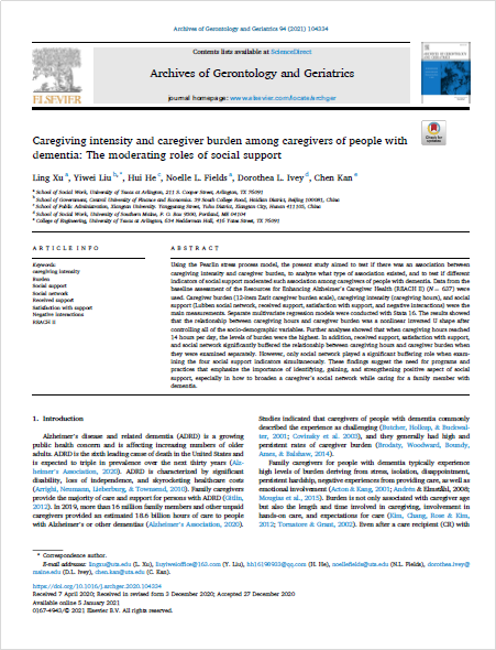 近日,永利集团官网公共事业管理系刘一伟博士以通讯作者在Archives of Gerontology and Geriatrics发表学术论文,题目为Caregiving intensity and caregiver burden among caregivers of people with dementia: The moderating roles of social support.