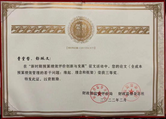 2022年2月,永利集团3044官网欢迎您行政管理系曹堂哲教授和2018级行政管理专业本科生彭珮文同学合作撰写的论文《全成本预算绩效管理的若干问题:缘起、理念和框架》获得财政部监督评价局与《财政监督》杂志社联合举办的“新时期预算绩效评价创新与发展”征文三等奖。