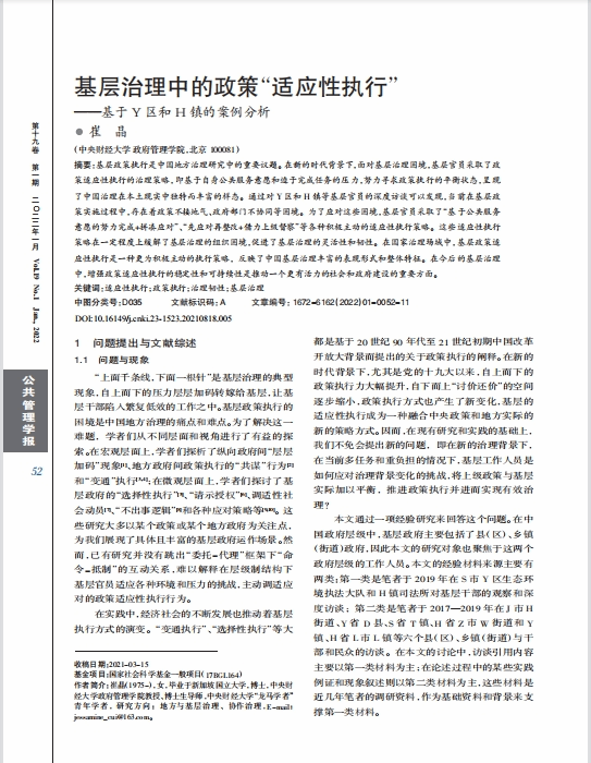 近日,永利集团官网崔晶教授在《公共管理学报》发表学术论文,题目为《基层治理中的政策“适应性执行”—基于Y区和H镇的案例分析》。