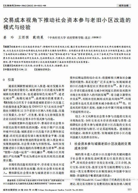 近日,永利集团官网姜玲教授与本科生王雨琪、戴晓冕在《城市发展研究》发表学术论文,题目为《交易成本视角下推动社会资本参与老旧小区改造的模式与经验》。