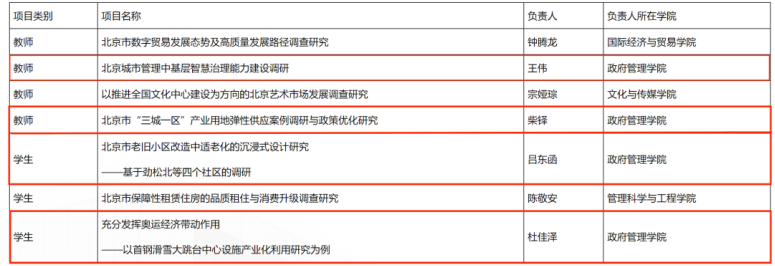 永利集团官网四支师生团队入选优秀项目,其中王伟副教授队伍的项目《北京城市管理中基层智慧治理能力建设调研》与柴铎副教授队伍的项目《北京市“三城一区”产业用地弹性供应案例调研与政策优化研究》入选教师组优秀项目;吕东函同学队伍的项目《北京市老旧小区改造中适老化的沉浸式设计研究——基于劲松北等四个社区的调研》与杜佳泽同学队伍的项目《充分发挥奥运经济带动作用——以首钢滑雪大跳台中心设施产业化利用研究为例》入选学生组优秀项目。