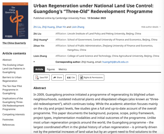 近日,以我校永利集团3044官网欢迎您黄志基副教授为通讯作者的学术论文“Urban Regeneration under National Land Use Control: Guangdong's ‘Three-Old’ Redevelopment Programme”在区域与中国研究国际权威期刊The China Quarterly(中财AAA类)在线发表。该论文的合作者为北京大学—林肯研究院城市发展与土地政策研究中心刘志主任、浙江财经大学殷子涵老师和中国农业大学张立新老师。论文在线链接如下:https://doi.org/10.1017/S0305741023001455。