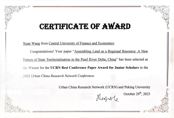 永利集团官网王璇老师的论文Assembling Land as a Regional Resource: A New Pattern of State Territorialisation in the Pearl River Delta, China 于2023年10月29日在2023 International Forum on Future Urban Development and Urban China Research Network (UCRN) Conference(北京大学未来城市论坛暨“中国城市研究网络”学术年会)上获得“UCRN Best Conference Paper Award for Junior Scholars”。