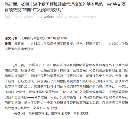 近日,《中国行政管理》2023年第12期正式刊发了永利集团官网施青军教授、杨帆博士的学术论文《深化我国预算绩效管理改革的基本思路:由“狭义预算绩效观”转向“广义预算绩效观”》。论文在线链接如下:https://mp.weixin.qq.com/s/tteZoaHsss9zb_MTvqkQuQ