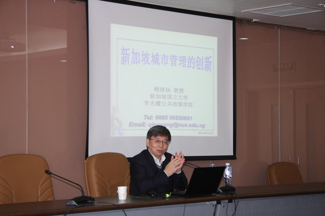 顾教授主要从新加坡城市管理的思路、理念、特点、改善城市管理的流程和关键性服务五个方面介绍了新加坡城市管理的创新之处。他首先介绍了新加坡资源稀缺、发展艰难的背景,提出“管理是生产力”的理念,并强调制度的重要性。在城市管理的思路设计中,顾教授将环境建设和可持续发展纳入城市规划体系,提出城市规划要有前瞻性。他表示在城市管理中凝聚民心形成共识是形成优质服务和优质管理的必要条件,并以新加坡行政管理的PPP模式举例说明。他以减少自由裁量权、建立有效的激励制度、处罚和收缴罚金相互分离等特点阐释新加坡优质管理的创新之处,并现身说法,用亲身经历介绍新加坡城市管理的科学性。在改善城市管理流程方面,顾教授提出“分工负责,部门协同”的理念,利用如电子政务等最新科技建设智慧城市。他最后强调,“安全、方便、清洁、宜居”是城市管理的关键性服务。