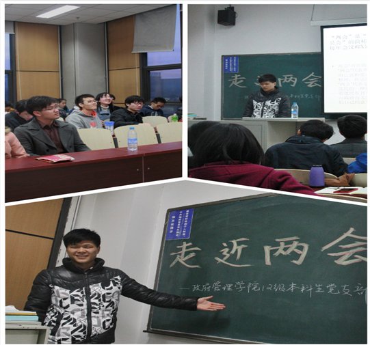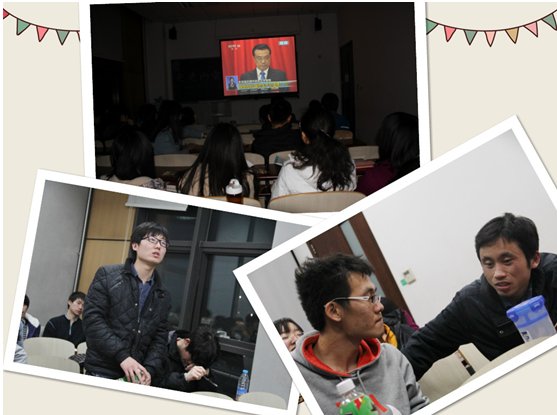 本次活动由党支部第三小组组织,小组组长孙文鹏同学主持会议。活动伊始,孙文鹏同学首先介绍了两会的大体概况以及与两会相关的知识。此外,关于两会的常识性知识,还做了现场问答,气氛十分活跃。同学们了解了相关常识之后,便观看了李克强总理的政府工作报告。大家集中精神,认真学习,还不时记录着笔记,十分投入。随后,党支部成员便就当前政府工作报告以及两会热点问题展开激烈的讨论,并就一些关心的问题发表自己的看法与意见。马小义同学结合专业知识做的关于城镇化与教育问题的发言以及宋亦明同学关于中国外交的建议非常精彩,赢得了大家的阵阵掌声。
