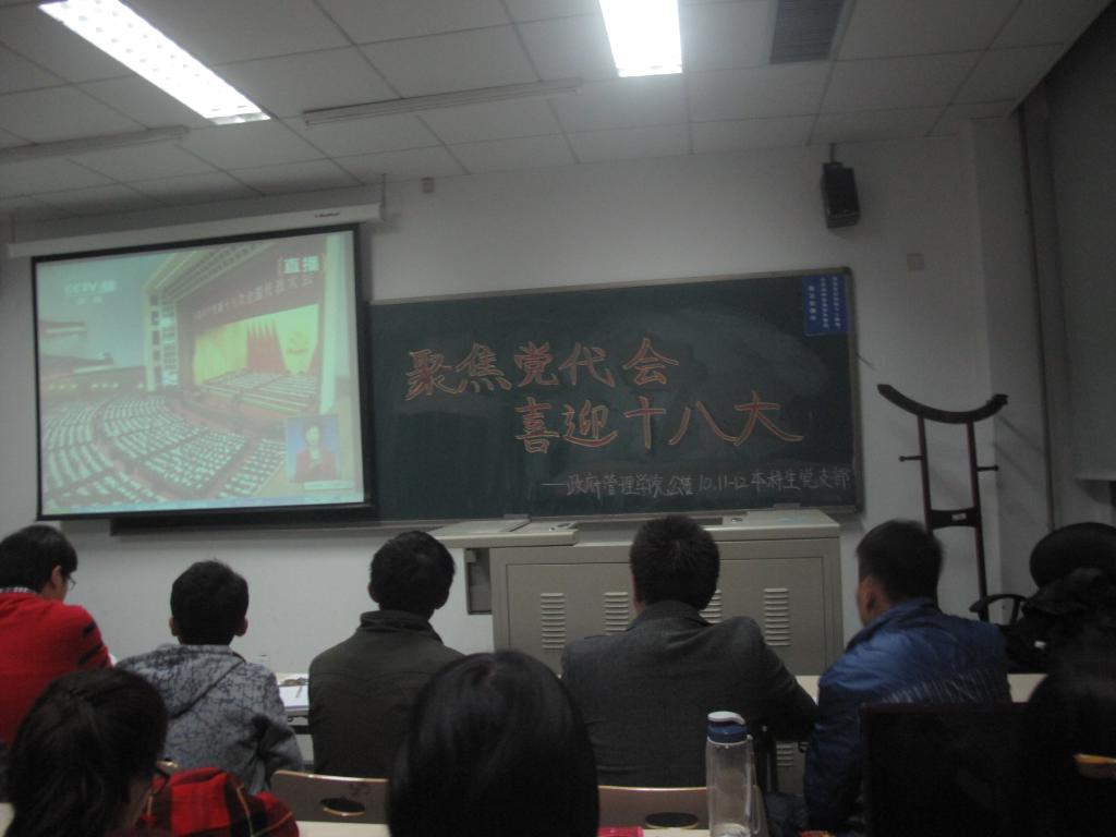 为认真学习党代会精神,2012年11月8日晚上七点,永利集团3044官网欢迎您10公管本科生党支部及11、12级本科生党支部在学院3号楼218教室举行了主题为“聚焦党代会喜迎十八大”的党代会观看活动。本次活动由10公管党支部副书记徐世黔同学主持,共有三个年级27名党员、预备党员以及部分入党积极分子参与。通过观看大会,大家更加深入地认识到我党不断发展与时俱进的进取精神和求真务实的工作作风。