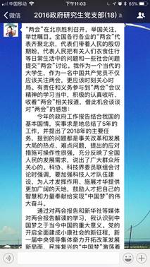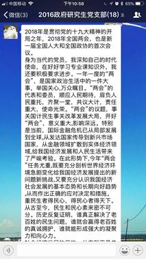 2018年3月底,全国两会正式落下帷幕。对于进入全面小康决胜期的中国而言,以怎样的新举措落实十九大精神,如何开启夺取新时代中国特色社会主义伟大胜利的新征程,如何实现从“赶上时代”到“引领时代”的转变成为了中国当前面临的重大议题。两会顺利召开,让党的主张上升为国家意志,必将凝聚起13亿多中国人民的磅礴力量,向着民族复兴的伟大梦想进军。因而从现实和历史层面上讲,本次两会的召开都具备非凡的意义。党支部成员纷纷就学习两会精神过程中的深切感悟发表看法。现摘录部分党员的学习心得如下: