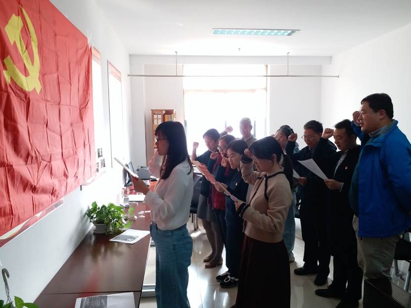 会议第一项,支部党员重温入党誓词。在李文彬书记的带领下,各支部党员面对党旗庄严宣誓,再次学习共产党员的入党誓词,旨在提高支部党员“拥护党的纲领”、“履行党的义务”的党性意识,身体力行“不忘初心、牢记使命”。