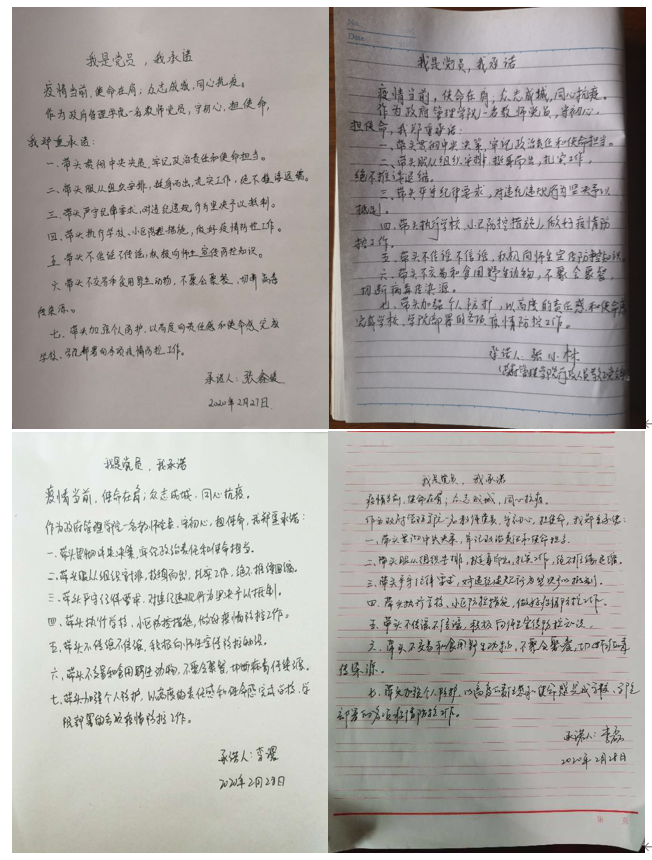 2月28日上午10:00,永利集团3044官网欢迎您行政人员教工党支部里利用微信平台举行“同心抗疫,共克时艰”线上主题党日活动。支部党员们在微信群中就近期学习实践情况进行交流,并集中学习了《习近平总书记在北京调研指导新冠肺炎疫情防控工作重要讲话精神》以及《习近平在统筹推进新冠肺炎疫情防控和经济社会发展工作部署会议上的讲话》,集中讨论了学校疫情防控工作的有关规定和要求。在“同心抗疫,从我做起”环节,支部成员以图片、视频、音频等多种方式上传“党员承诺书”,承诺要坚定抗疫信心,坚守自身岗位,发挥共产党员的带头作用,以实际行动为抗击疫情做贡献!