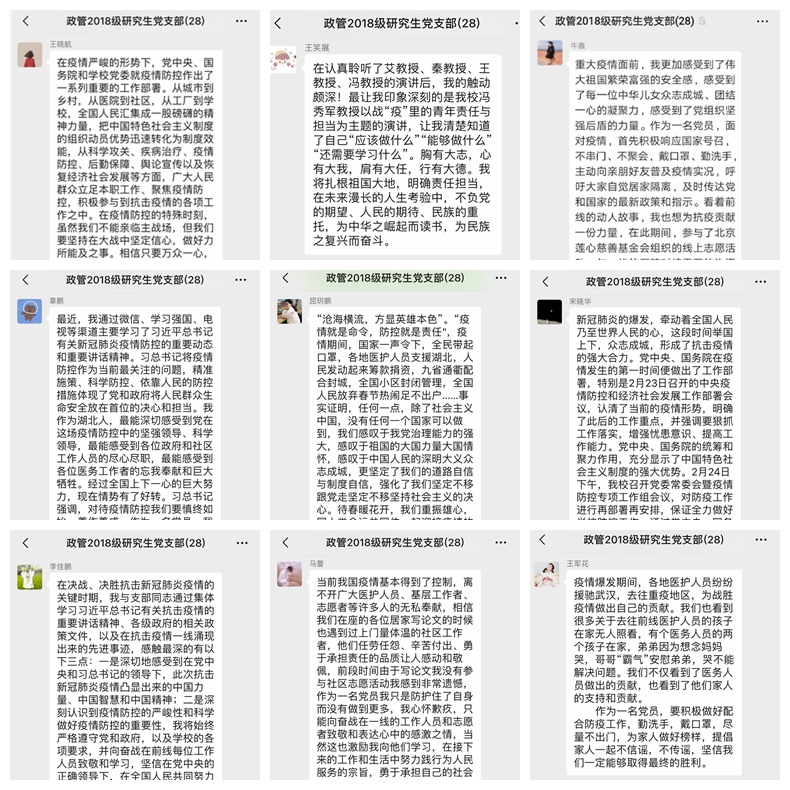牛鑫同志:作为一名党员,面对疫情,首先积极响应国家号召,不串门、不聚会,戴口罩、勤洗手,主动向亲朋好友普及疫情实况,呼吁大家自觉居家隔离,及时传达党和国家的最新政策和指示。看着前线的动人故事,我也想为抗疫贡献一份力量,在此期间,参与了北京莲心慈善基金会组织的线上志愿活动,与一线的医院对接需要的物资信息,采集物资接收反馈,前线医生的朋友圈时常诉说着把病人从死神手中抢回来的喜悦,时常牵挂着仍在疫区受苦的病人,无不感动和鼓舞着我。我坚信,伟大的中华民族必将迎来抗疫胜利;我坚信,人民有信仰,国家有力量,民族有希望。