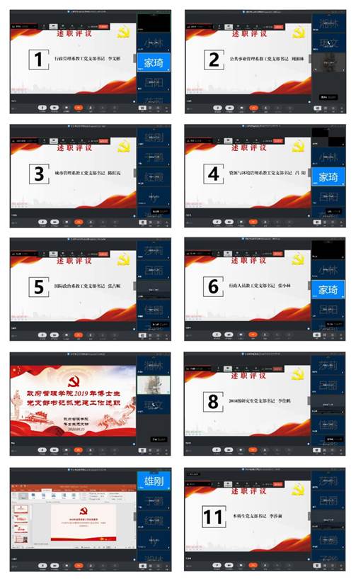 会议上,共有10位党支部书记进行线上述职汇报,1位党支部书记进行书面述职。各位党支部书记围绕学习贯彻落实习近平新时代中国特色社会主义思想、党的十九大精神和十九届四中全会精神、切实开展“不忘初心、牢记使命”主题教育、推进“两学一做”学习教育常态化制度化、贯彻全国教育工作会议和各级思想政治工作会议精神、抓党建促进支部建设等方面,重点介绍了自己在2019年的履职情况,展示了支部党建工作开展的特色做法和亮点,同时对支部党建工作存在的工作难点和问题进行了阐述,提出了进一步加强基层党组织建设的思路和措施。与会人员普遍反映,深入学习贯彻党的十九大精神系列活动和“不忘初心、牢记使命”主题教育切实增强了永利集团官网师生党员的“四个意识”,坚定“四个自信”,做到“两个维护”,锻炼并提升了各党支部书记的能力水平,但同时与会人员也反映理论学习有待于深入,党建工作创新性有待于提高,支部建设与“双一流”建设结合有待于加强等切实存在的问题。