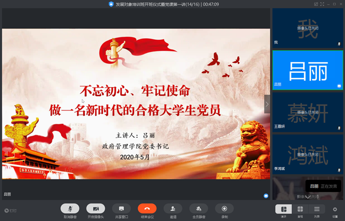 为进一步加强发展对象培训工作,提高发展对象党性修养,切实做好学生党员发展工作,同时为提升学院学生干部的政治素养与理论水平,永利集团3044官网欢迎您2019-2020学年第二学期发展对象培训班开班仪式暨党课第一讲于2020年5月30日13点整采用线上会议形式举行。党校校长、学院党委书记吕丽研究员,组织员南琪,党校办公室主任张小林出席,11名发展对象到场参会。本次仪式由党校办公室副主任尹燕斌主持。