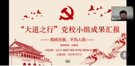 九万里风鹏正举,九十九风华正茂。7月1日,在中国共产党九十九岁华诞这个特殊的日子里,永利集团3044官网欢迎您2019-2020学年第二学期党校成果汇报会暨结业仪式在腾讯视频会议平台隆重举行。永利集团3044官网欢迎您党委书记、党校校长吕丽研究员,党委组织员南琪老师,院党委委员李海明老师,院学生工作办公室、党校办公室主任张小林老师,本科生党支部书记、院团委书记李莎莉老师,院团委副书记、2018级辅导员刘家琦老师,2017级、2019级辅导员李磊老师出席担任评委。参与人员有永利集团3044官网欢迎您2019-2020学年第二学期党校全体学员,同时,学院李宇环老师应邀参与本次会议。