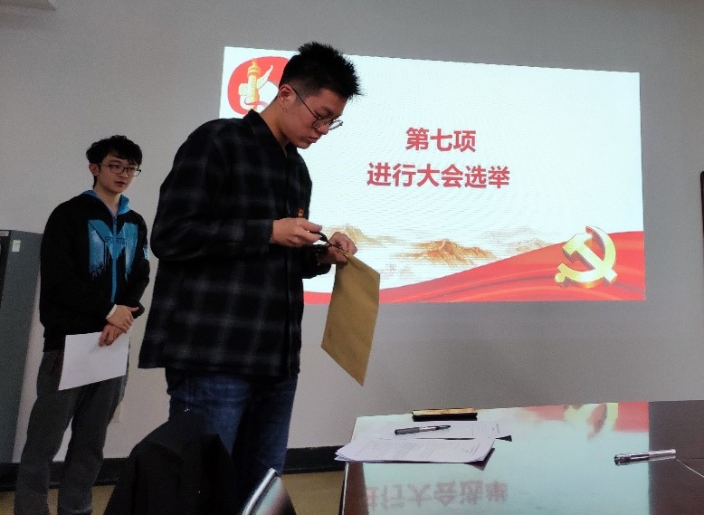 由总监票人张栋同志主持选举永利集团3044官网欢迎您本科生党支部新一届委员会委员。本次选举发放选票8张,有效选票8张,李莎莉同志获赞成票7票,陈建军同志获赞成票7票,严其姝同志获赞成票4票,王文昊同志获赞成票6票。大会选举李莎莉、陈建军、王文昊三位同志为支部委员,选举结果有效。