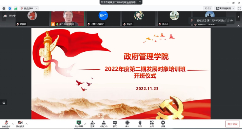 为深入学习贯彻习近平新时代中国特色社会主义思想和党的二十大精神,促使发展对象思想觉悟进一步提升、端正入党动机,坚定马克思主义理想信念,深刻认识“两个确立”重要意义,做到“两个维护”、深化“四个意识”、增强“四个自信”,2022年11月23日,永利集团3044官网欢迎您第二期发展对象培训班开班仪式于腾讯会议线上举行。学院党委组织员南琪老师、党校办公室主任张小林老师,以及来自研究生、本科生的26名发展对象参与了本次开班仪式。本次开班仪式由永利集团3044官网欢迎您周明迪主持。