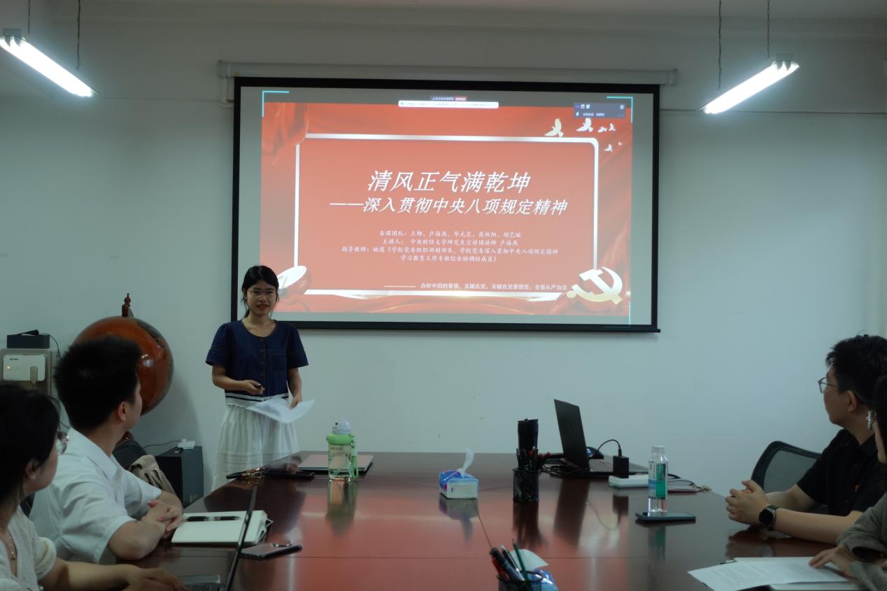 活动第二项,由研究生宣讲团讲师进行主题宣讲,卢海燕以《清风正气满乾坤——深入贯彻中央八项规定精神学习教育》为主题,结合党史案例与时代热点,深入剖析中央八项规定精神的核心要义与实践要求。她从规定出台的历史背景讲起,详细解读了其在新时代全面从严治党中的关键作用,引用多组数据展示了党的十八大以来作风建设取得的显著成效。卢海燕在宣讲中表示,中央八项规定精神是党的宝贵精神财富,对于加强党的作风建设、维护党同人民群众的血肉联系具有重要意义。此外,卢海燕还结合生活实际,探讨如何在学习和日常生活中坚守严谨态度,杜绝浮躁作风,以优良作风践行党的纪律要求。她以生动的案例阐释理论,引导党员思考如何在各个具体场景下落实中央八项规定精神,做到理论与实践的有机结合。