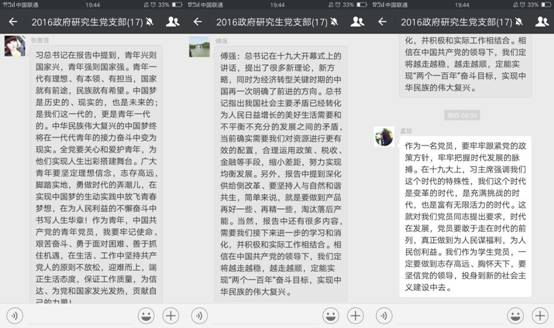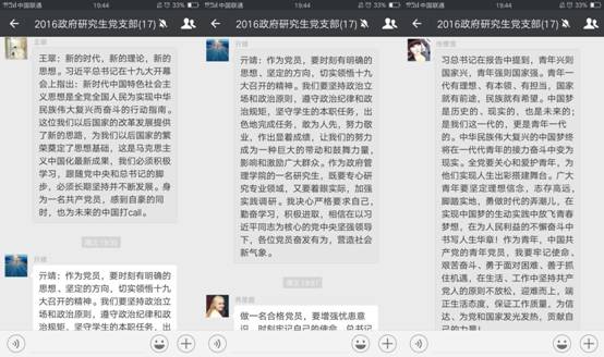 线上讨论由支部书记朱洁主持,他表示,党的十九大作为在中国特色社会主义发展关键时期召开的一次大会,具有非比寻常的意义。习近平总书记在大会上的所作的报告内涵丰富,思想深刻,是指导党和国家未来发展的纲领,值得我们每一个人深入学习,并将其贯彻到日常的工作学习生活中。在以习近平同志为核心的党中央的坚强领导下,十八大到十九大的这不平凡的五年中,国家发展取得了举世瞩目的成就。作为一名中国共产党党员,我们为党感到骄傲;作为一名中财永利集团3044官网欢迎您的研究生,我们为国家治理体系和治理能力的进步感到自豪。十九大报告让我们深切感受到党领导下的中华民族伟大复兴的中国梦的可期可待。作为青年党员,我们要不忘初心,牢记自己肩上的使命与责任,始终高举中国特色社会主义伟大旗帜,与全国人民同呼吸,共命运,以党的十九大精神为动力,努力学习,为中国特色社会主义建设事业贡献自己的力量。