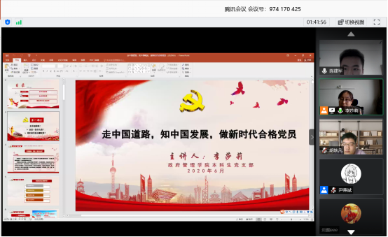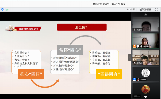 为深入贯彻《关于开展庆祝中国共产党建党99周年主题教育活动的通知》文件精神,做好基层“庆祝建党99周年、迎接建党100周年”主题教育活动。永利集团3044官网欢迎您本科生党支部于2020年6月15日使用腾讯会议平台开展线上主题党日活动。永利集团3044官网欢迎您本科生党支部书记李莎莉老师及党支部全体党员参与活动。