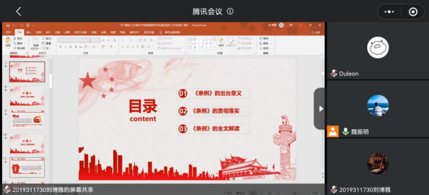 随后,主持人为党小组成员播放CCTV13新闻联播中对《条例》的初步解读,全体党小组成员一并观看并认真学习了新闻联播中传达的对《条例》学习思路和学习建议。观看视频之后,魏振明同志带领全体组员系统学习了《条例》共十章内容,在学习的过程中体会《条例》的颁布对于全面贯彻党的教育方针,落实立德树人的根本任务,建设高质量教育体系、建设教育强国所具备的重要意义。小组成员通过学习课件再一次深入学习和阅读了《条例》的具体内容和相应的实施细则,进一步领悟到《条例》对于新时代党的建设总要求和新时代党的组织路线的重要指引意义,并据此展开了相应讨论和交流。