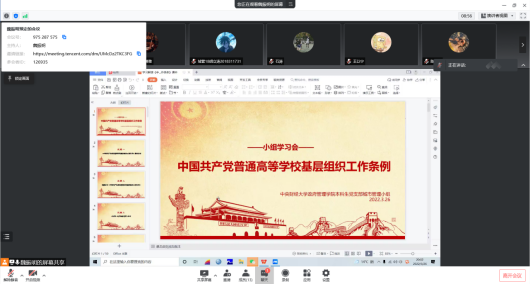 近日,中共中央印发了修订后的《中国共产党普通高等学校基层组织工作条例》(以下简称《条例》),并发出通知,要求各地区各部门认真遵照执行。学习要求受到永利集团3044官网欢迎您城市管理党小组高度重视,并于2022年3月26日召开例会组织学习。会议于20:00通过腾讯会议线上开展,由党小组组长魏振明主持召开。