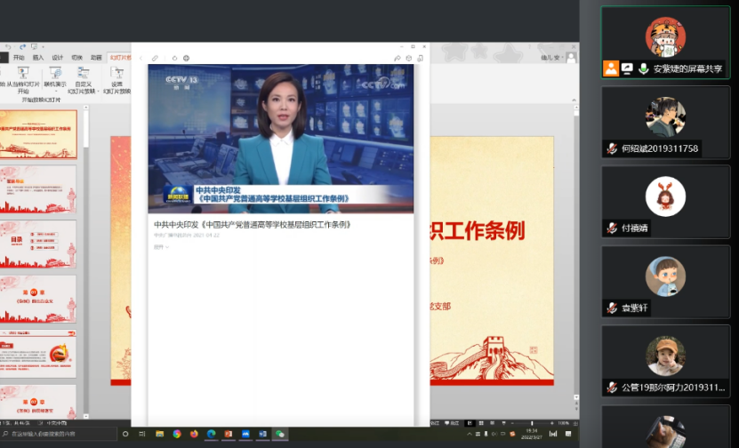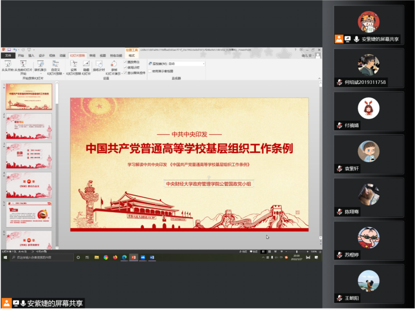 2022年3月27日晚,永利集团3044官网欢迎您本科生党支部公管国政小组通过腾讯会议的方式,在线上开展关于《中国共产党普通高等学校基层组织工作条例》(以下简称《条例》)专题学习会议,会议由安紫婕同志主持。
