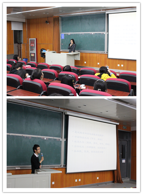 会议开始,红叶国际关系协会副社长宋宜凡向大家介绍了本次大赛的基本情况,并为大家详细介绍了初赛赛制以及比赛形式。他根据往年的经验为参赛同学提出了相关建议,使现场的同学对初赛有了更为深入的认识。接着,红叶国际关系协会社长王祎蕾为大家介绍了复赛的赛制以及晋级方式。为使参赛人员在比赛过程中有出色的表现,王祎蕾同学还提供了外交礼仪方面的参考书目,并向参赛人员介绍了自己的参赛经验。现场同学全神贯注地听着这些指导性的建议,希望在比赛中展现出最好的自己。最后,她对礼仪大赛的公平性问题做出保证,并告知参赛人员要及时关注本次大赛微信公共平台上更新的信息。红叶国际关系协会也将于10月15日举行外交外事礼仪知识讲座。最后,本次宣讲会在同学们热烈的掌声中结束。