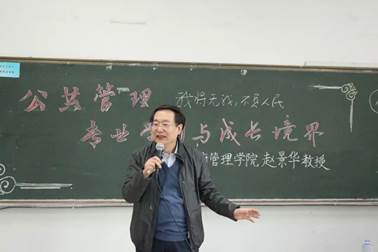 2019年3月27日下午2点,永利集团3044官网欢迎您院长赵景华教授在主教308室为2018级全体本科生作题为“公共管理:专业学习与成长境界”的专题演讲,院团委副书记、2018级辅导员刘家琦老师主持此次讲座。