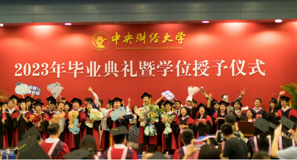 典礼第七项,2023年新校友接收仪式,姜玲院长向校友年级理事颁发聘书,于鹏书记赠送礼包。自此,2023届毕业生们从中财大政管毕业,正式加入中财校友大家庭,无论未来飞得多远,中财大政管永远是同学们温暖的家。