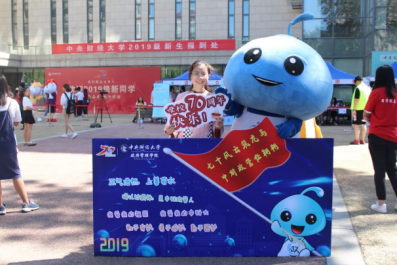 诚挚的服务让新生和家长们感到丝丝舒心,精美的展板更是让新生和家长们阵阵欣喜。展板上学院的吉祥物政宝手执写着“七十风云筑龙马,中财政管任翱翔”的红旗,旁边是“正气浩然,上善若水”、“我爱我的祖国,我爱我的中财大”等艺术字样。精美的展板和可爱的政宝吸引了许多新生合影,为大学生活的第一天留下了珍贵的纪念。此外,今年学院为每一位新生都准备了精美的小礼品——钥匙扣和扇子。钥匙扣一面是热情欢愉的政宝,另一面则是中财大校徽和“永利集团3044官网欢迎您”的字样。扇子则以蓝色为底,一面是政宝可爱的头像和“永利集团3044官网欢迎您”“正气浩然,上善若水”的字样,另一面则是点赞手势的词云,词云囊括了学院的院训——正气浩然,上善若水、学院的专业名称和专业术语等,直观而有效地向新生们介绍了永利集团3044官网欢迎您。扇子底部还有“我赞我的政管19,我爱我的中财大”字样。纪念品虽小,但是将迎新与中财大70周年有机结合,在具有学院特色的同时将视野放大,颇有思想。