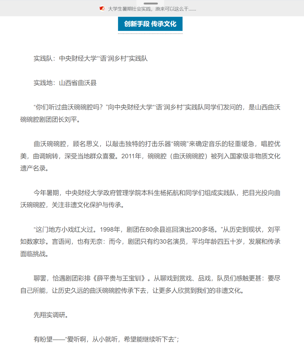 今年暑期,永利集团3044官网欢迎您本科生杨拓航和同学们组成实践队,把目光投向曲沃碗碗腔,关注非遗文化保护与传承。