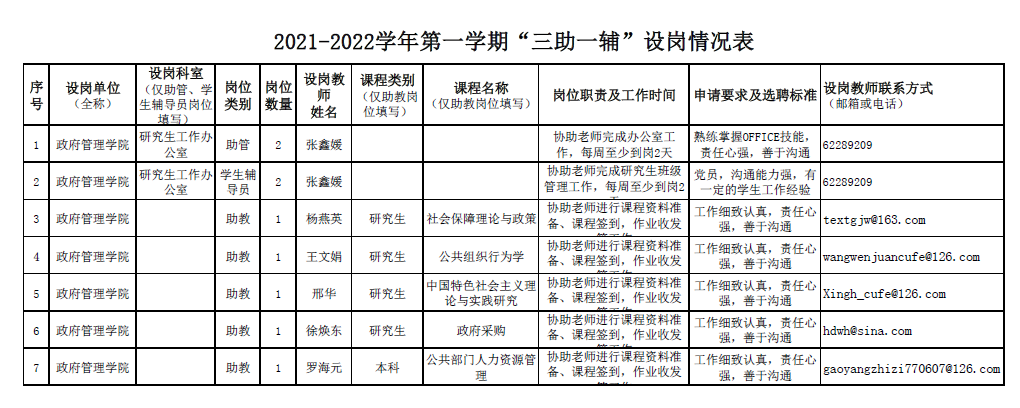 永利集团3044官网欢迎您2021-2022学年第一学期“三助一辅”设岗情况