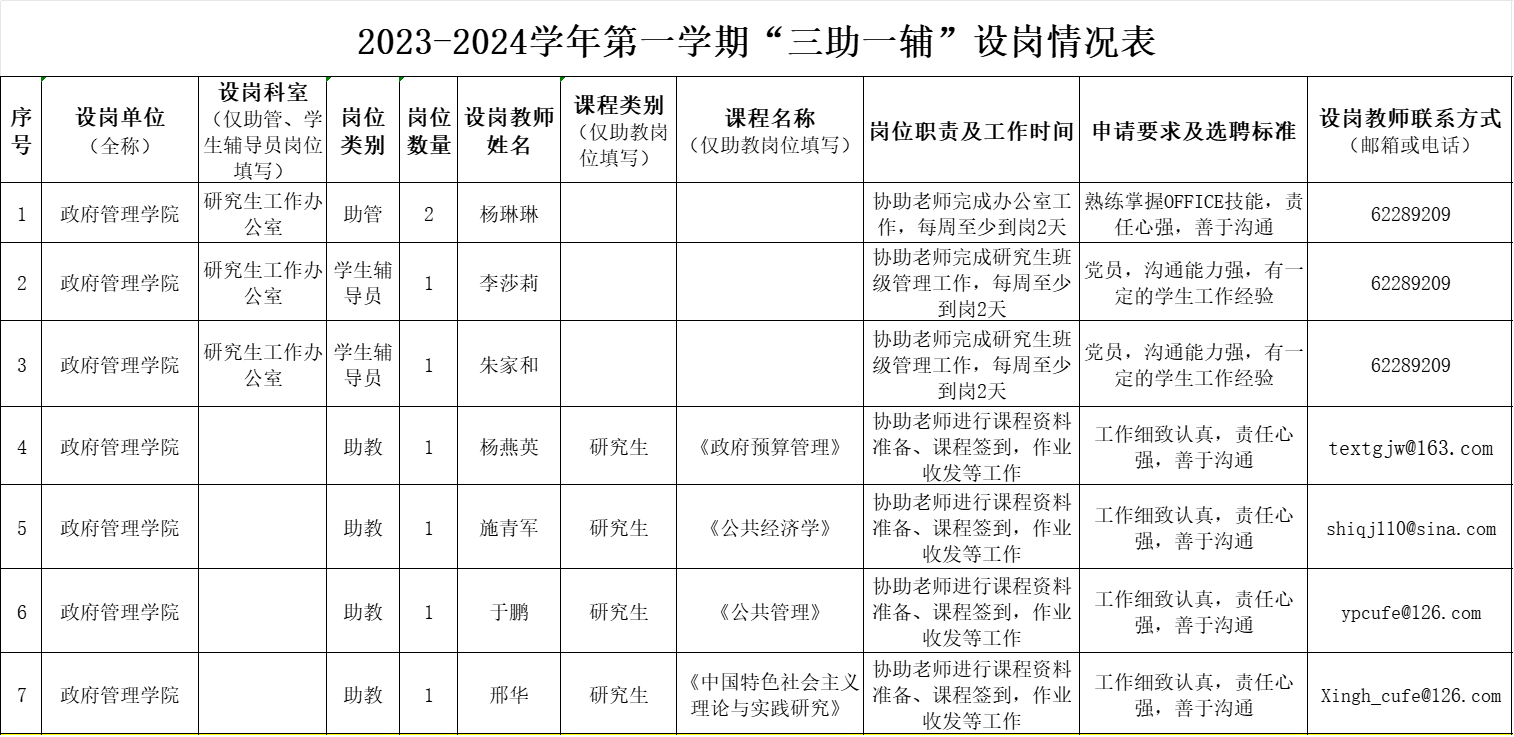 永利集团3044官网欢迎您2023-2024学年第一学期“三助一辅”设岗情况表