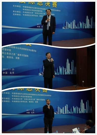 大赛的最后,三位评委对队伍的表现进行了现场点评。纪丰伟评委指出了大赛的三大亮点:第一,选题新颖并贴近实际;第二,“市长”选手们涉猎的知识涉及公共管理学、行政管理学、法学和法社会学,广博全面;第三,“市长”选手们谈到的很多社会问题都结合了党的十九大和认真学习贯彻了习近平新时代中国特色社会主义思想,反映出当代大学生的时代风貌。田中俊评委肯定了学生市长的研究主题,认为这些问题接地气,符合实际,都是社会热点问题,对当前的社会现实有较强的指导意义,同时田市长指出“学生市长”们进行了深刻的调研,响应了中央对干部的要求,他对新一代“市长”们给予深厚期望。屈新评委表达了他在本次大赛中的感受和收获,并衷心祝愿模拟市长大赛能够越办越好。