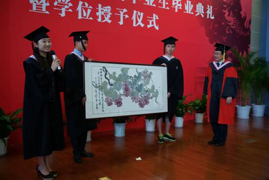 接着是毕业生向学院赠送礼物仪式。“祝愿永利集团3044官网欢迎您的未来犹如画中硕果累累的葡萄一样蓬勃发展,再创辉煌。”2010级本科毕业生向学院赠送的国画《硕果累累》表达了对学院的深深祝福。2012级学术研究生则将精心制作,包含了他们研究生阶段经验和感悟的毕业纪念册赠与学院,并向学弟学妹赠送了200本专业书,向学院图书阅览室赠送了精美的书架。纪念册、书籍和书架分别寓含收获、传承和发扬之意,表达了他们对政管学子都能鸿鹄展翅千万里,而勿忘当年卧槽时的美好希冀。2012级MPA双证班别出心裁,向学院赠送了提有“上善若水”四字的屏风,表达了同学们对学院的感恩与热爱,以及牢记院训、担当责任、勇往直前的决心。